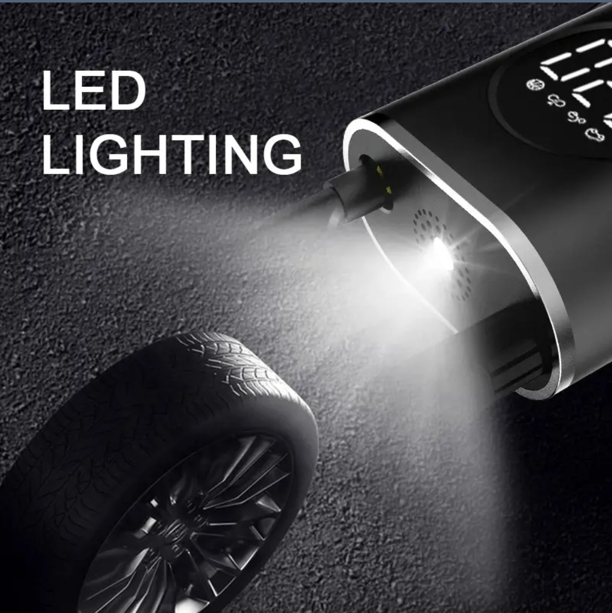 Portable digital air pump with LCD display and rechargeable battery. Ideal for inflating car, bike, and motorcycle tires, as well as balls and inflatables. Compact, accurate, and easy to use anywhere.
