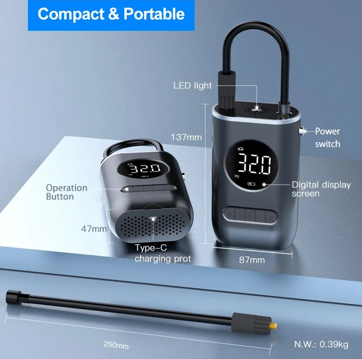 Equipped with a powerful built-in motor and rechargeable battery, this portable inflator ensures quick inflation without the need for external power. Its lightweight, cordless design makes it an essential companion for road trips, emergencies, and daily use.